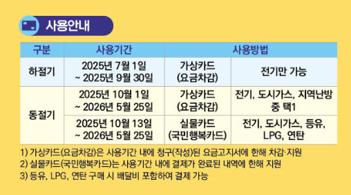 기존에는 계절별로 정해진 금액을 사용할 수 있었지만, 올해부터는 여름과 겨울 구분 없이 통합 금액을 자유롭게 사용할 수 있도록 변경되었습니다.