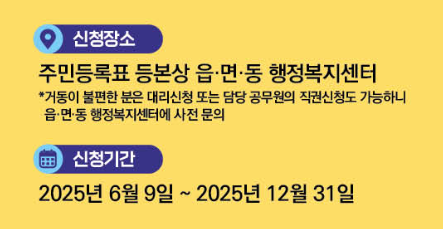 신청 기간은 2025년 6월 9일부터 12월 31일까지이며, 전국 각지의 행정복지센터를 통해 접수할 수 있습니다.