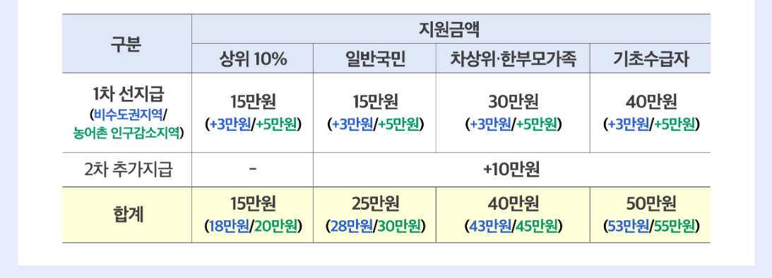 일반국민: 총 25만 원 (지역 조건 포함 시 최대 30만 원)